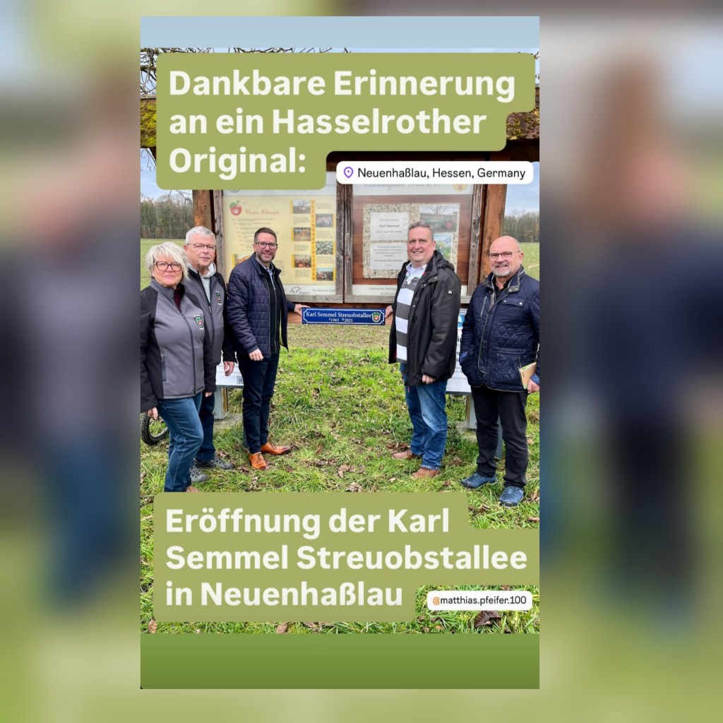 Wir haben uns heute in Neuenhaßlau mit dem Landrat des Main-Kinzig-Kreises Thorsten Stolz, dem Bürgermeister der Gemeinde Hasselroth Matthias Pfeifer, dem Vorstand des Obst- und Gartenbauvereins Neuenhaßlau und zahlreichen Vereinmitgliedern getroffen, um Karl Semmel zu würdigen.